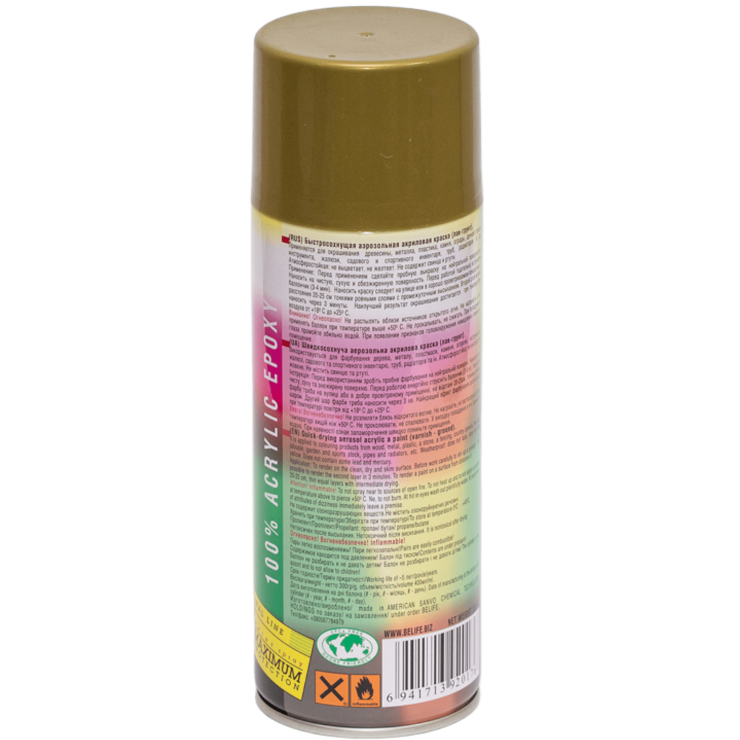 Основные характеристики Универсальная акриловая аэрозольная эмаль BeLife золото металлик (139)