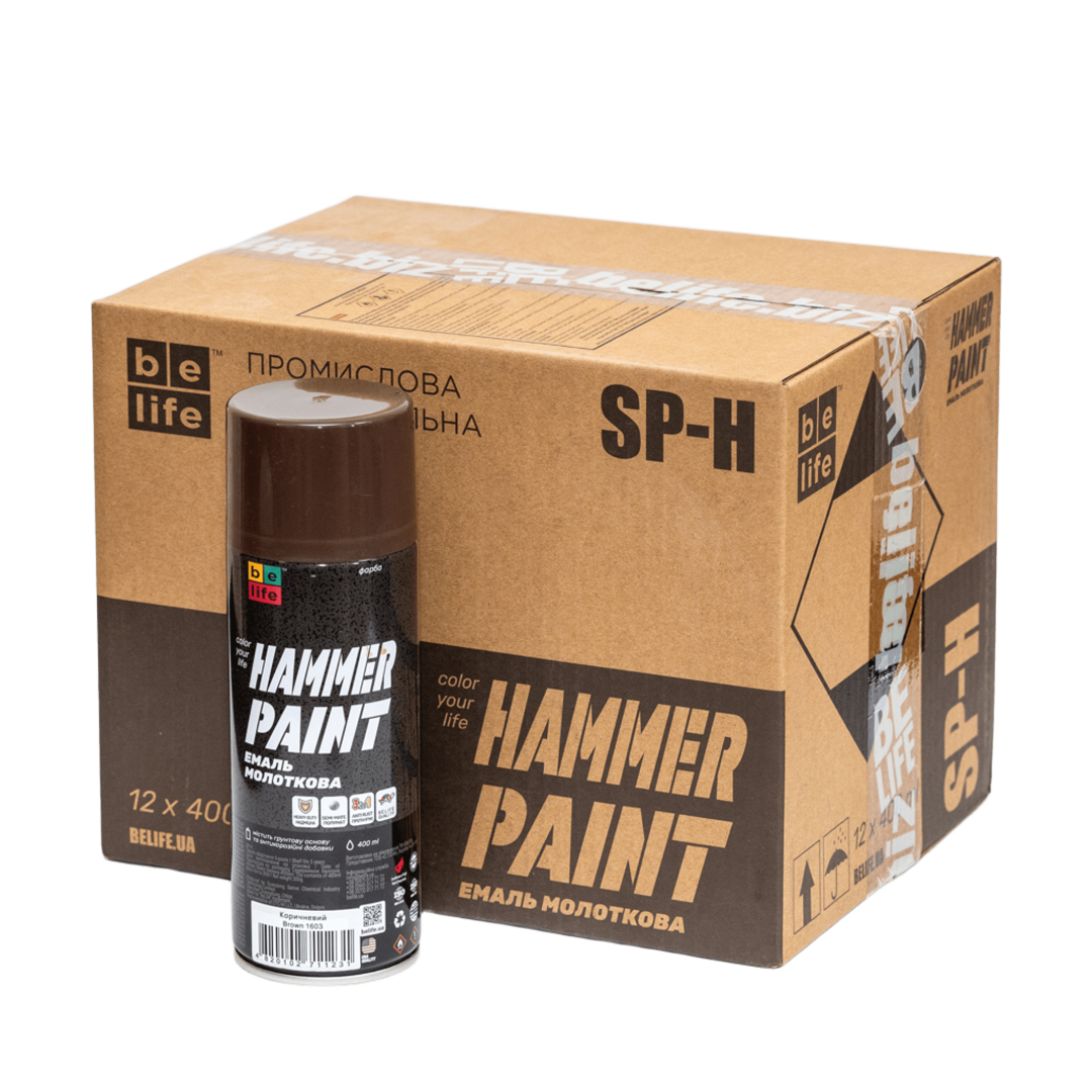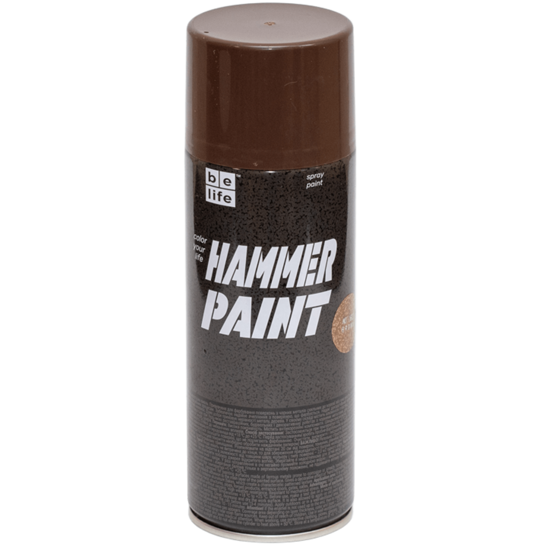 BeLife Spray Paint Hammer – аэрозольная акриловая эмаль с «молотковым» эффектом, для окрашивания поверхностей из черных металлов подверженных коррозии или уже имеющих следы ржавчины. Оказывает декоративный эффект «ручная молотковая чеканка», образуя своеобразный фактурный рисунок. Отлично скрывает неровности металла, дерева. В своем составе содержит алюминиевые хлопья, создающие характерную кружевную фактуру. Можно окрашивать металлоконструкции, трубы, кованые изделия, входные двери, ворота, сейфы.