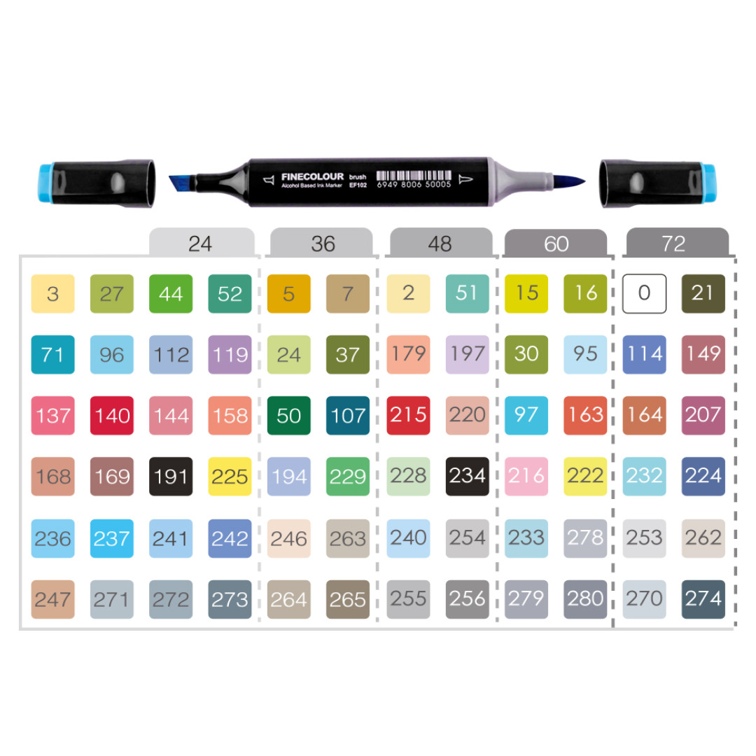 Набор маркеров Finecolour Brush 24 Colours включает: EF102-3, EF102-27, EF102-44, EF102-52, EF102-71, EF102-96, EF102-112, EF102-119, EF102-137, EF102-140, EF102-144, EF102-158, EF102-168, EF102-169, EF102-191, EF102-225, EF102-236, EF102-237, EF102-241, EF102-242, EF102-247, EF102-271, EF102-272, EF102-273.