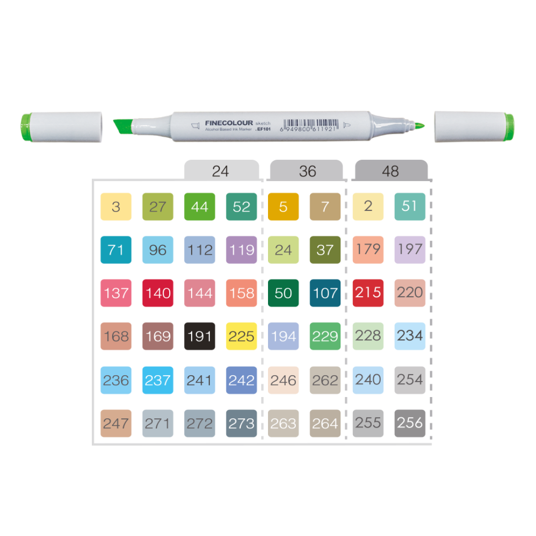 Набор маркеров Finecolour Junior 36 Colours включает: EF101-3, EF101-5, EF101-7, EF101-24, EF101-27, EF101-37, EF101-44, EF101-50, EF101-52, EF101-71, EF101-96, EF101-107, EF101-112, EF101-119, EF101-137, EF101-140, EF101-144, EF101-158, EF101-168, EF101-169, EF101-191, EF101-194 EF101-225, EF101-229, EF101-236, EF101-237, EF101-241, EF101-242, EF101-246, EF101-247, EF101-263, EF101-264, EF101-265, EF101-271, EF101-272, EF101-273.