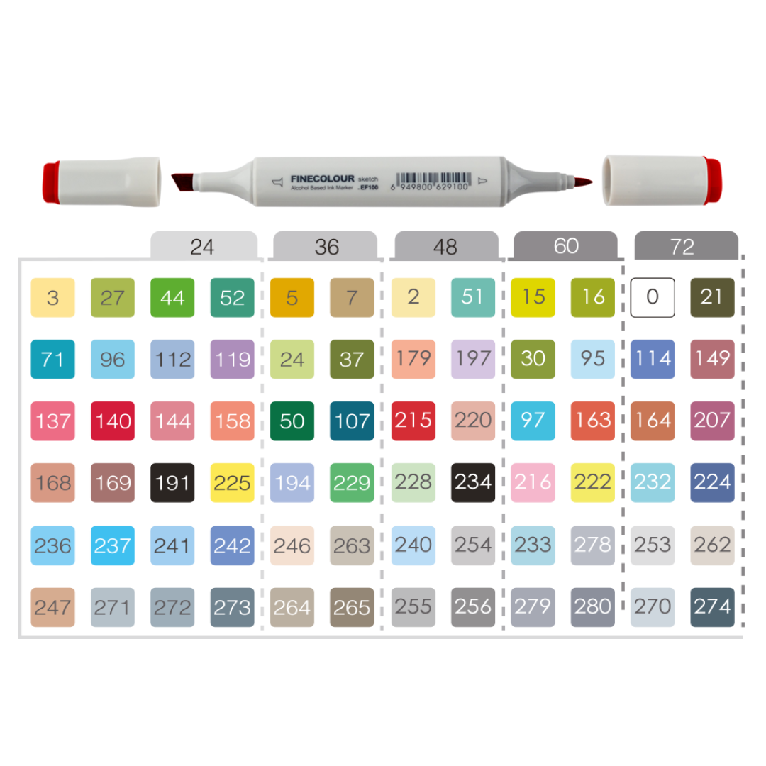 Набор маркеров Finecolour Sketchmarker 36 Colours включает: EF100-3, EF102-5, EF100-7, EF100-24, EF100-27, EF100-37, EF100-44, EF100-50, EF100-52, EF100-71, EF100-96, EF100-107, EF100-112, EF100-119, EF100-137, EF100-140, EF100-144, EF100-158, EF100-168, EF100-169, EF100-191, EF100-194, EF100-225, EF100-229, EF100-236, EF100-237, EF100-241, EF100-242, EF100-246, EF100-247, EF100-263, EF100-264, EF100-265, EF100-271, EF100-272, EF100-273.