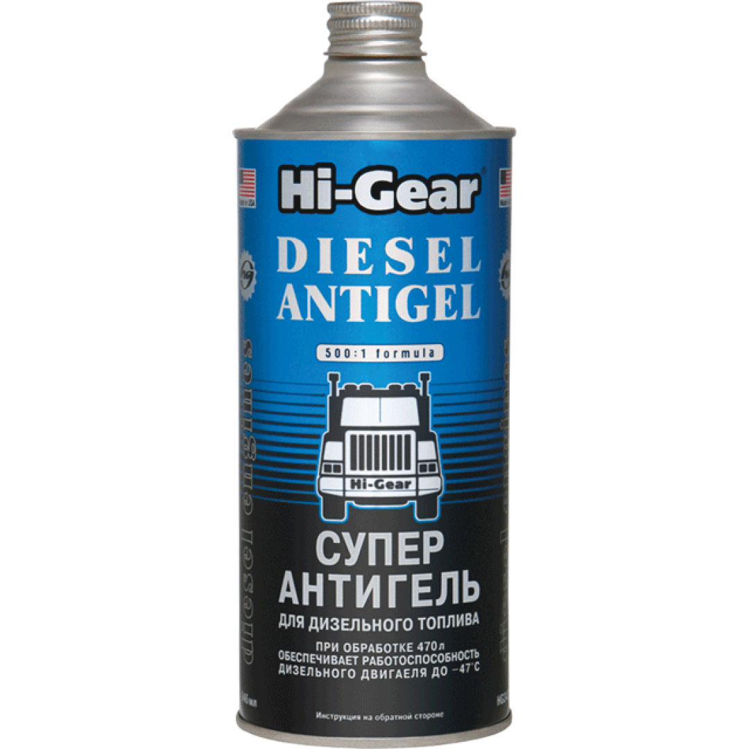 Супер антигель дизтоплива 1:500 Hi-Gear – обеспечивает бесперебойную работу дизельного мотора и всей системы топлива при температуре до -47 градусов Цельсия. Не теряет свои возможности при очень низких температурах. Смазка и защита инжекторов. Повышение коэффициента сгорания топлива. Связывает водный конденсат.