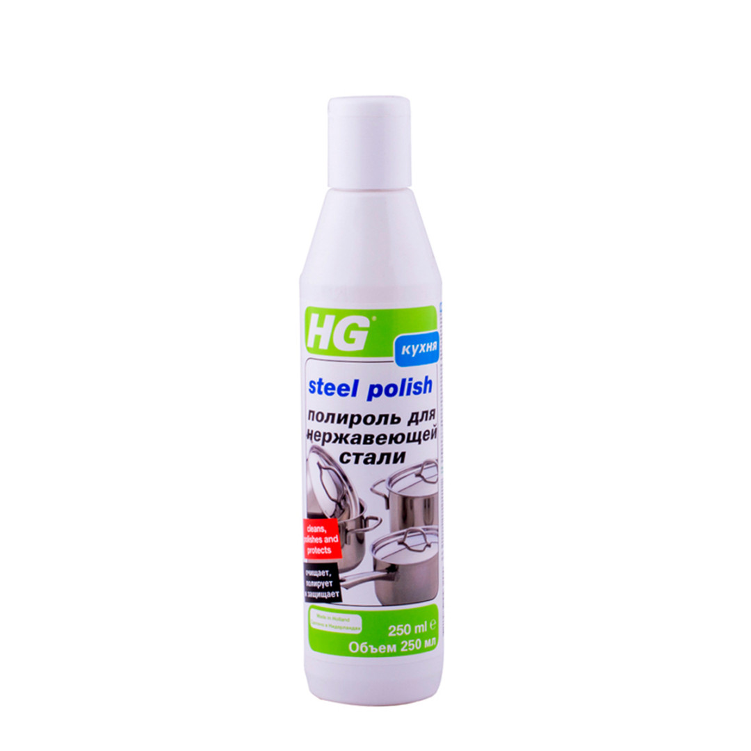 Полироль для стали HG – для ухода за предметами из нержавеющей стали и алюминия, а также хромированных поверхностей. Универсальное средство для очистки, полировки и защиты изделий из стали. Идеально подходит для вытяжек, раковин из нержавеющей стали, посудных сушек, кастрюль, сковородок, чайников, микроволновок, плит и другой стальной, алюминиевой и хромированной кухонной техники, а также синтетических раковин, хромированных кранов и т.д.