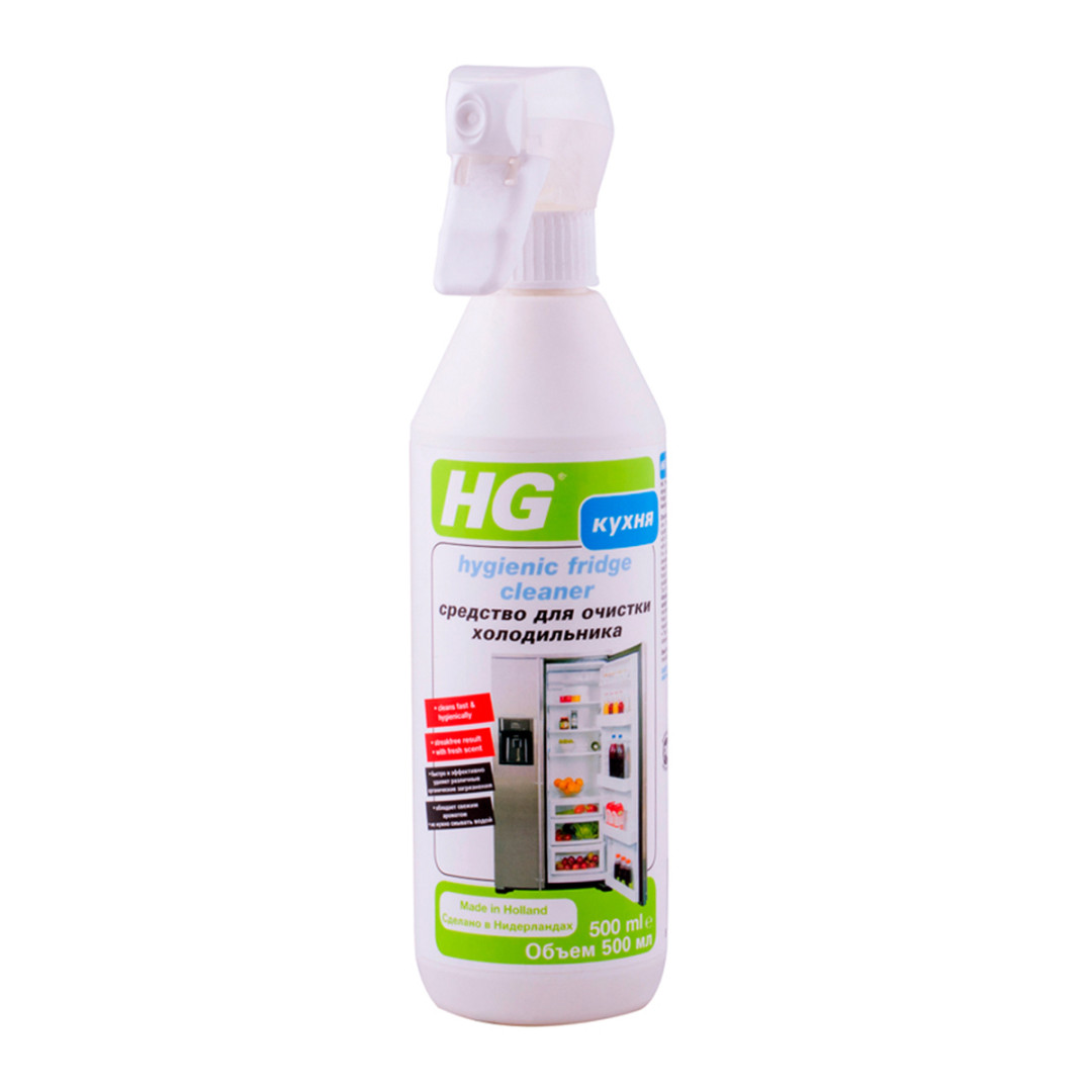 Средство для гигиенической очистки холодильника HG-спрей для очистки холодильника и поверхностей со свежим ароматом: быстро, гигиенически и тщательно, без полос. В состав средства входят специальные масла, продлевающие срок эксплуатации резиновых уплотнителей. Подходит для гигиенической очистки любых поверхностей, например детских стульев для кормления, кухонных поверхностей и т.д. Не подходит для изделий из текстиля! Не требует смывание.