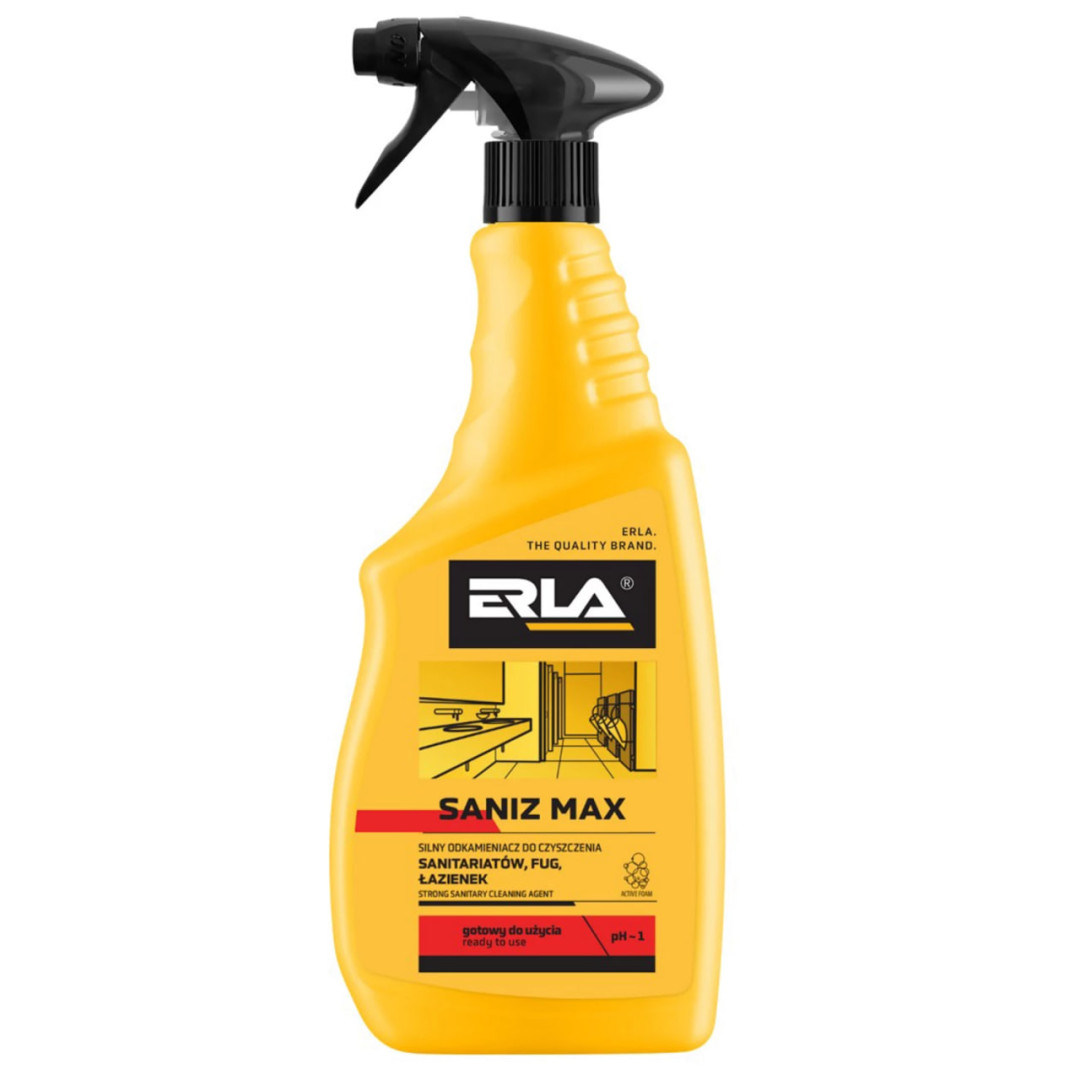 Erla Saniz Max — для чистки санитарных помещений и ванных комнат, в частности для тщательной уборки общественных помещений, офисов и ванных комнат. Кислотное средство для удаления накипи предназначено в основном для профессиональных клининговых компаний. Удаляет ржавчину, накипь, известковый налет и остатки мыла, которые долго не мылись, для чистки унитазов, писсуаров, биде, умывальников, ванн, душевых поддонов, душевых кабин, элементов из нержавеющей стали, керамики, полов, цементных швов, плитки и сантехники для ванных комнат. Устраняет неприятные запахи мочи и оставляет освежающий эффект после использования без удушающего аромата хлора и отбеливателя.