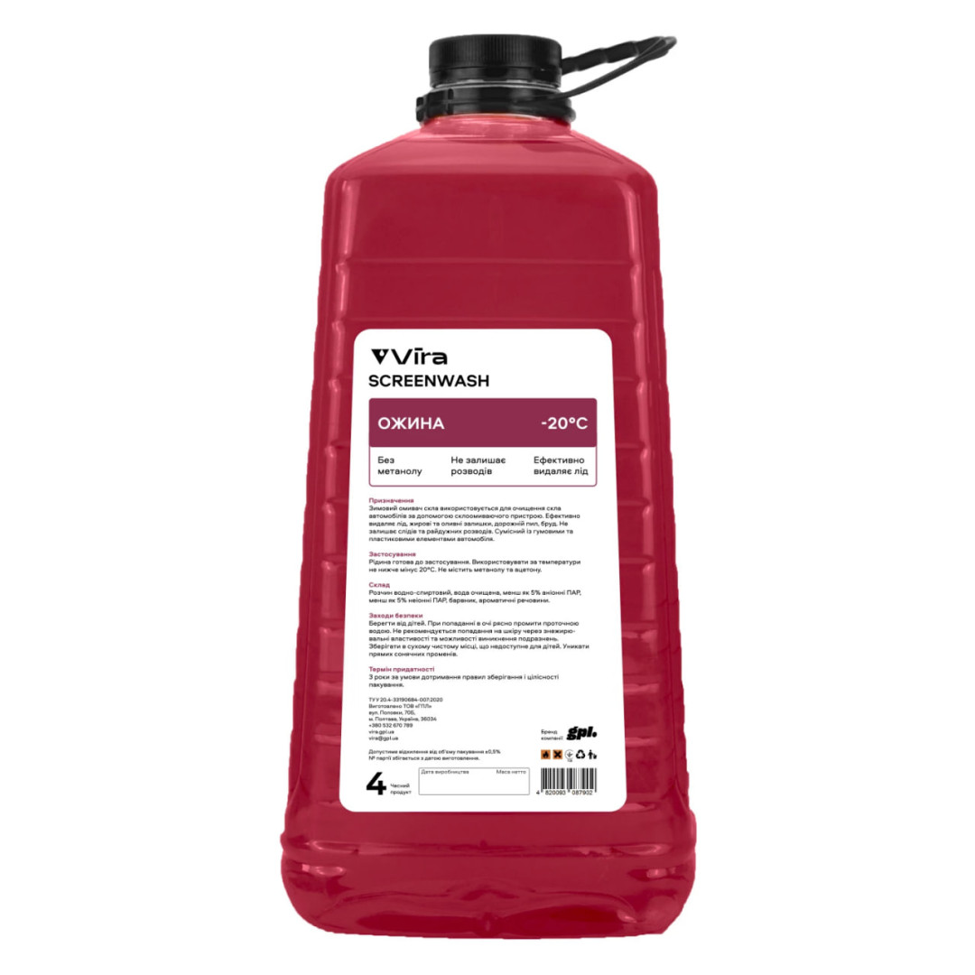 Омыватель стекла зимний VIRA - готовый к применению. В составе анионны ПАВ, денатурированный этанол, очищенная вода, красящий пигмент, ароматизатор.