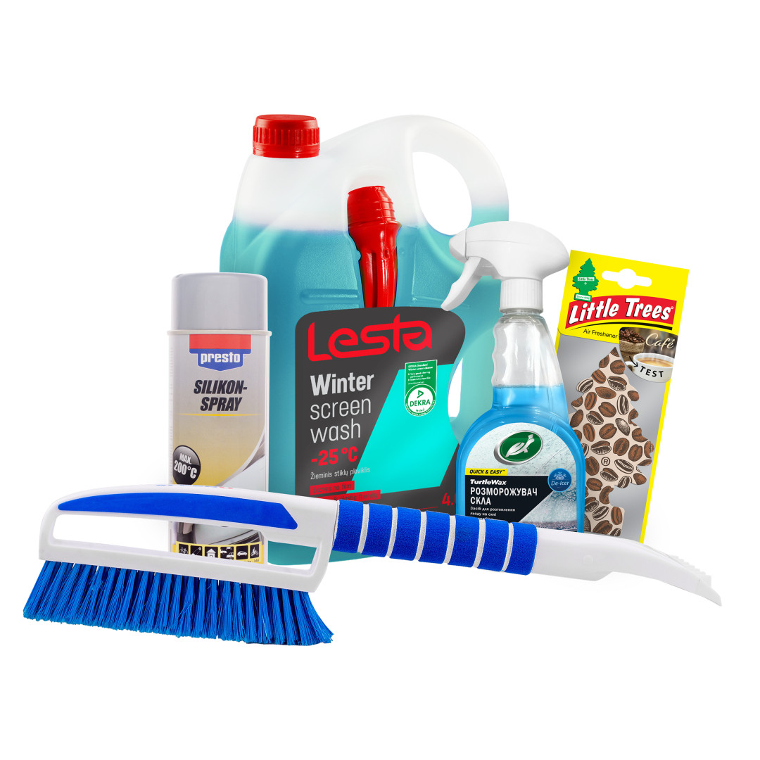 Специальный набор зимних товаров для автомобилистов: деликатная щетка для очистки снега со скребком Everest ALPEN 1; омыватель стекла зимний –80 C концентрат Turtle Wax 1л; освежитель воздуха 'Морозная сосна' Little Trees; размораживатель стекла Lesta, 500 мл; размораживатель замков аэрозольный Motip Black Line 75 мл.