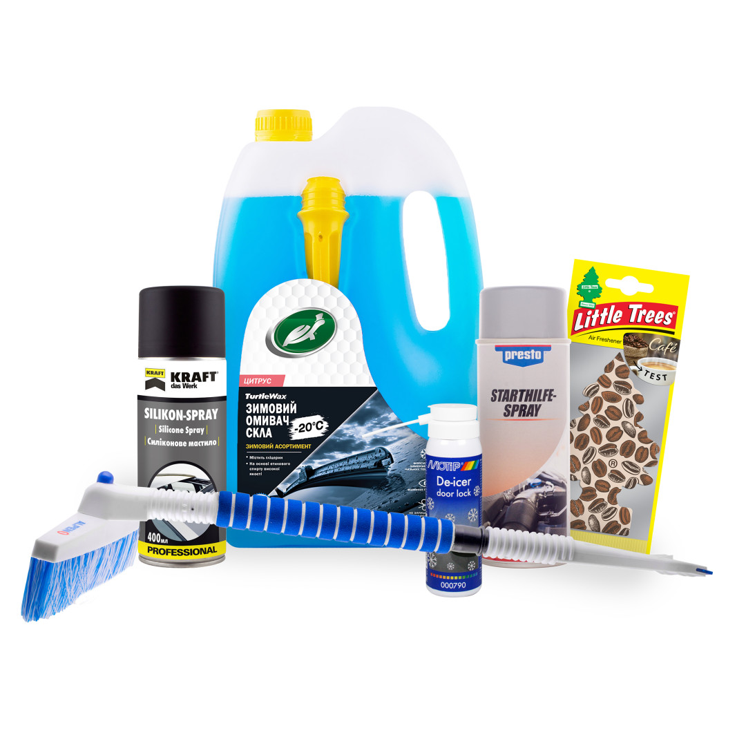Специальный набор зимних товаров для автомобилистов: телескопическая щетка для очистки снега со скребком Rota Brush Telescope ALPEN 1; омыватель стекла зимний –20 C Turtle Wax 4 л; освежитель воздуха 'Кофе' Little Trees; смазка силиконовая ТМ KRAFT в аэрозольной упаковке 400 мл; быстрый старт Presto 400 мл; размораживатель замков аэрозольный Motip Black Line 75 мл.