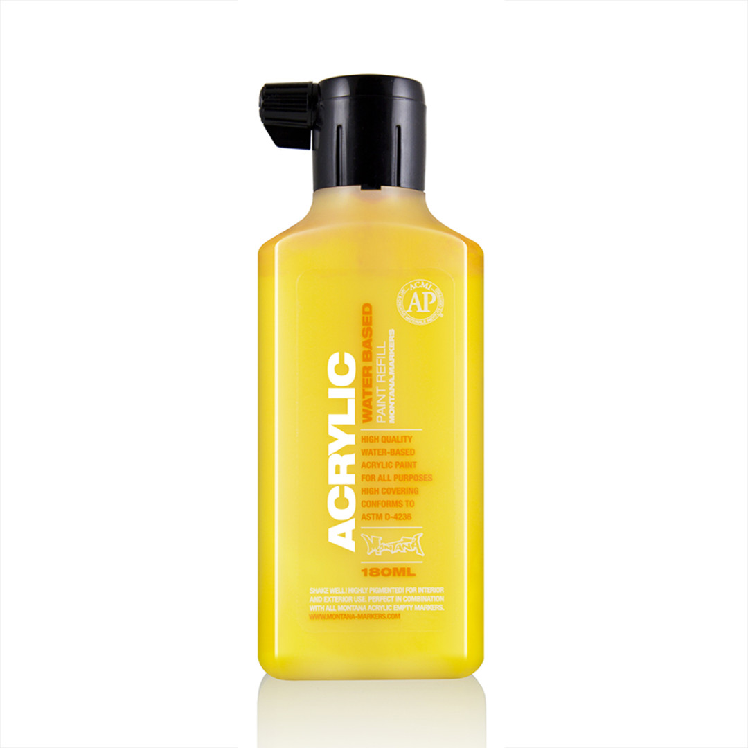 Montana Acrylic Paint Refill — краска для заправки акриловых маркеров, которая также подходит для сквизеров, аэрографов и нанесения кистью. Высокопигментированные акриловые чернила создают хорошее насыщенное покрытие. Быстро сохнет, устойчиво к ультрафиолетовому излучению и атмосферным воздействий. После полного высыхания становится матовой. Цвета можно смешивать между собой. Ее можно использовать вместе с соответствующими цветами линейки Montana аэрозоле. Может применяться на любых поверхностях, таких как холст, дерево, стекло, стены и металл. В качестве растворителя можно использовать ацетон.