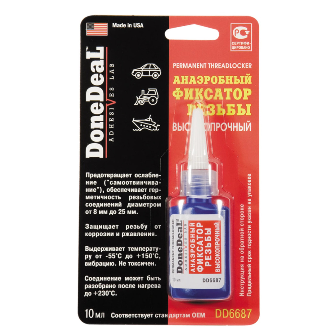Фиксатор резьбы Done Deal автопродукт для герметичного и устойчивого соединения резьба деталей, подвергающихся действию агрессивных внешних факторов. Обладает высокой прочностью, работает в широком. диапазоне температур. Герметик используется для защиты резьбы от высокого напряжения, вибрационных и ударных и активных нагрузок. химические вещества. Продукт равномерно распределяет нагрузку по соединению, фиксируя и герметизируя его, предотвращает самовольное раскручиванию и отсоединению деталей, а также возникновение на них коррозии. Схватывается за 15 минут, полностью твердеет за час. Фиксирует детали коленвала, трансмиссии, шпильки ГБЦ.