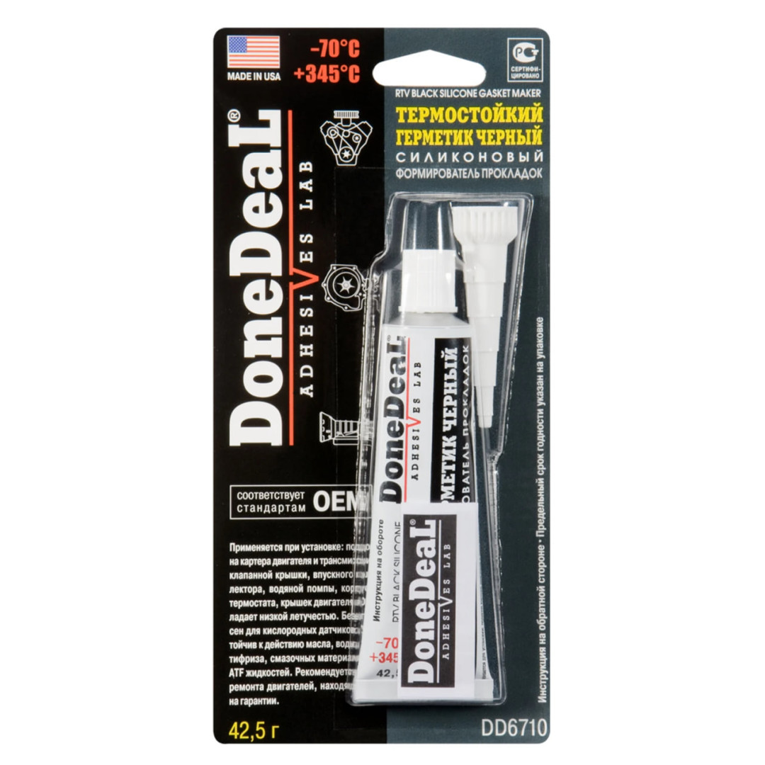 Термостойкий силиконовый герметик для формирования прокладок Done Deal (черного цвета) по классификации товара является формировщиком прокладок ОЭМ. В его состав входят отвердитель, винилтриаксетоксисилан, функциональные присадки, что обеспечивает полноценный процесс вулканизации при комнатной температуре. Герметик отличается повышенной эластичностью и влагостойкостью.