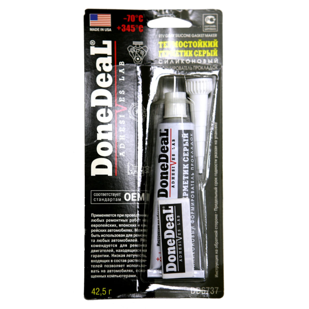 Термостойкий силиконовый герметик для формирования прокладок Done Deal (серого цвета) по классификации товара является формировщиком прокладок ОЭМ. В его состав входят отвердитель, винилтриаксетоксисилан, функциональные присадки, что обеспечивает полноценный процесс вулканизации при комнатной температуре. Герметик отличается повышенной эластичностью и влагостойкостью.