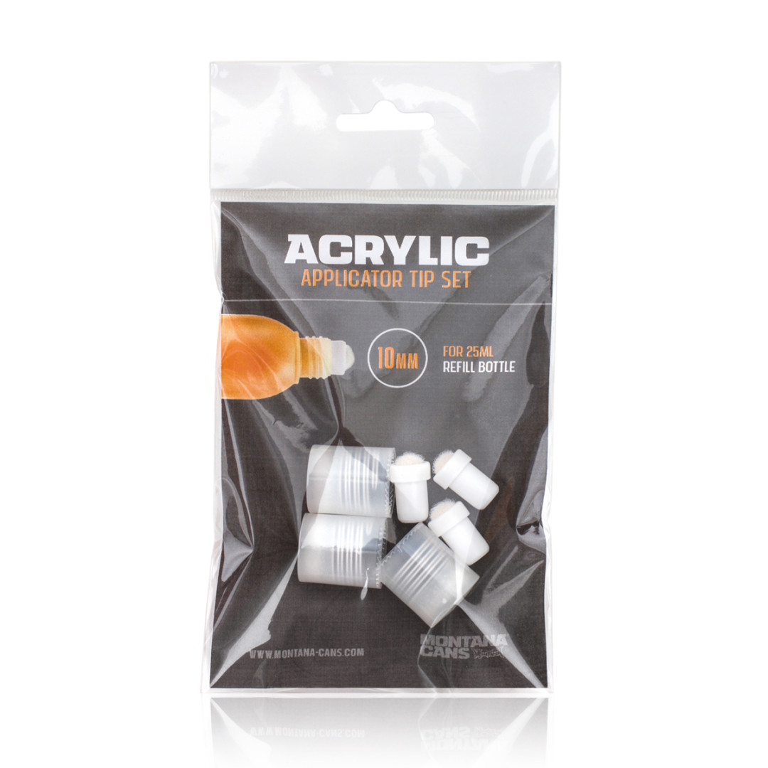 Montana Acrylic Applicator Tip — 10 мм аппликаторы для маленьких 25 мл акриловых заправок Монтана. Наконечник расширяет возможности делая любую заправку средством для маркировки. 10-миллиметровый наконечник представляет собой закругленное круглое перо из ткани. Перья легко чистится путем промывки чистой воды либо отстаивания в ней. Набор доступен в упаковках по 3 шт, с тремя крышками, чтобы обеспечить длительное использование без высыхания.