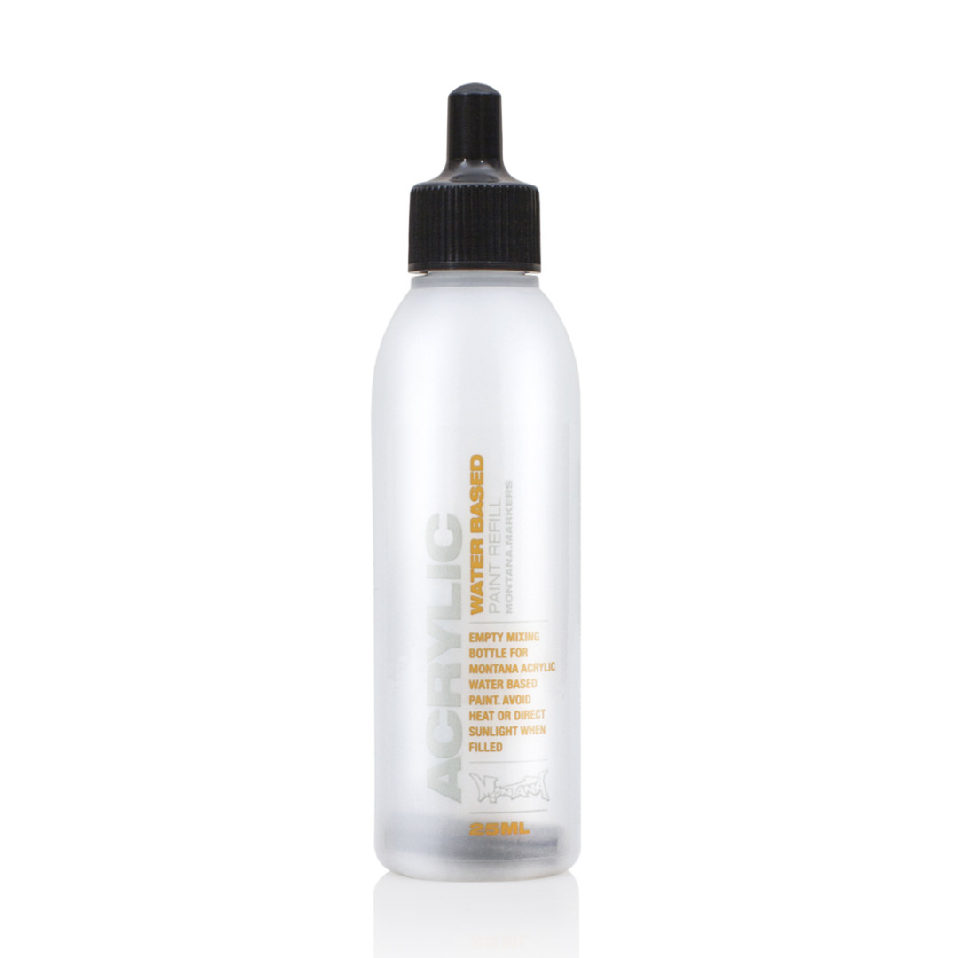 Пустая бутылка 25 мл для смешивания цветов Montana ACRYLIC PAINT. Бутылка прозрачна для легкой оценки оставшегося содержимого. Для достижения оптимальной эффективности рекомендуется использовать с пустыми бутылками только заправки для акриловой краски Montana.