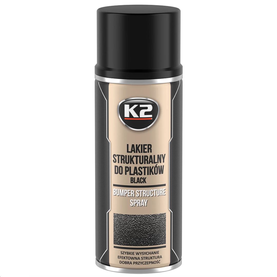 K2 BUMPER быстросохнущий черный текстурированный лак для пластика. Для покраски бамперов без необходимости грунтовки. Создает стойкое к повреждению покрытие. Позволяет достичь желаемой текстуры, маскируя недостатки поверхности и имитируя естественный вид пластика при необходимости.