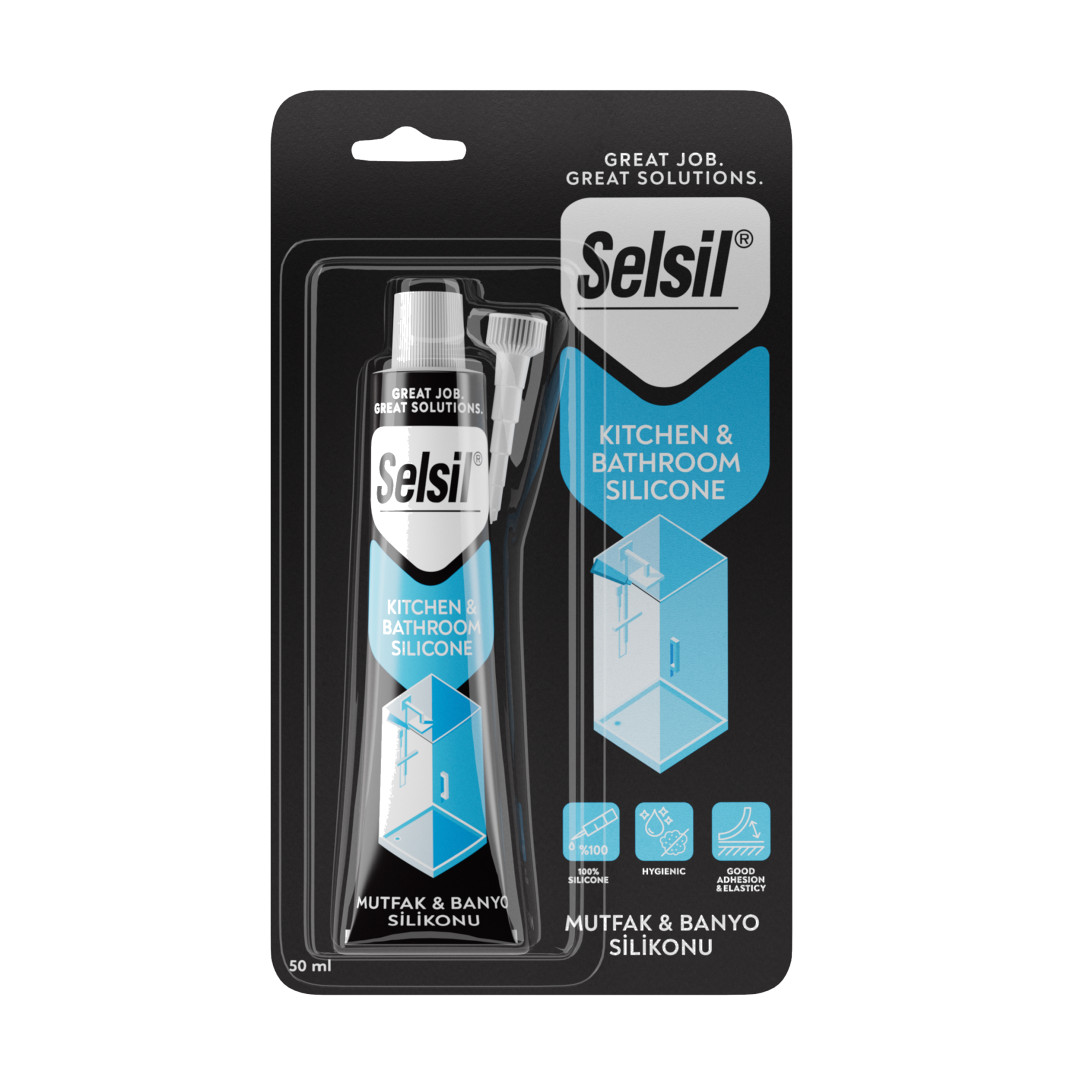 Selsil Kitchen & Bathroom Silicone высокоэффективный однокомпонентный кислотный силиконовый герметик, предназначенный для заполнения и герметизации щелей в широком спектре санитарно-технических областей применения: герметизация соединений сантехнической фурнитуры и уплотнения стыков на кухнях и в ванных комнатах. систем. Исключительная стойкость к плесени и грибку, устойчива к экстремальным температурам и состарению, не растрескивается и не теряет цвет, устойчива к моющим и чистящим средствам и химическим веществам в целом.