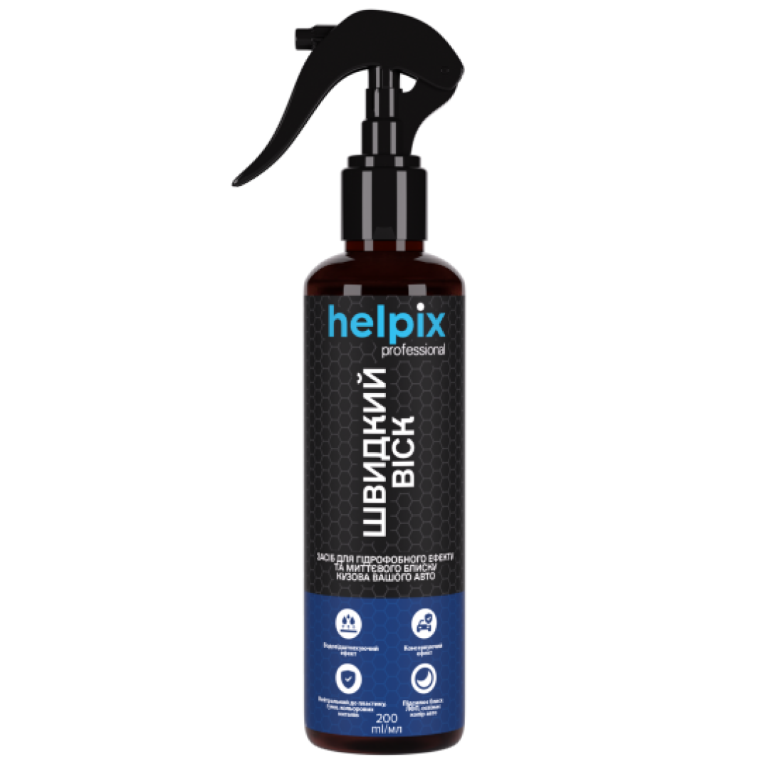 Средство по уходу за кузовом Быстрый воск Helpix для финишной обработки лакокрасочного покрытия автомобиля после мытья, формирование порозаполняющего слоя на поверхности ЛКП. Освежает цвет, придает блеск, гидрофобный эффект и обеспечивает долговременную самоочистку обработанных поверхностей. Замедляет фотокаталитическое старение лакокрасочного покрытия кузова. Проникая в мельчайшие повреждения ЛФП, на время формирует гидрофобный заполняющий слой, предупреждающий возникновение точечной коррозии. Не оставляет разводы, помутнения. Не содержит агрессивных составляющих. Безопасный для лакокрасочных покрытий, пластика, резины.