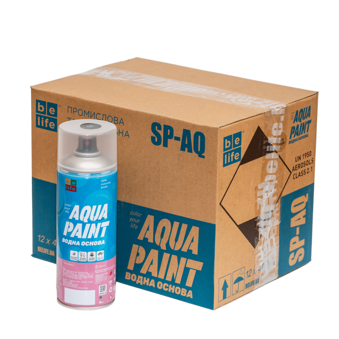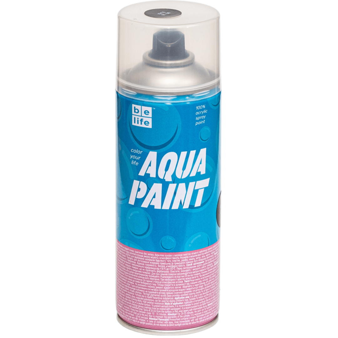 BeLife Spray Aqua – аэрозольная краска на водной основе, не содержащая растворителей. Не повреждает полистирол, практически без запаха. Краска имеет высокий уровень укрывистости, сочные цвета. Предназначена для покраски материалов любого типа: пластик, дерево, камень, металл, лоза, картон, ткань, керамика, стекло. Подходит для покраски полистирола, детских игрушек. Применяется внутри и снаружи помещений. Имеет полуматовую фактуру.
