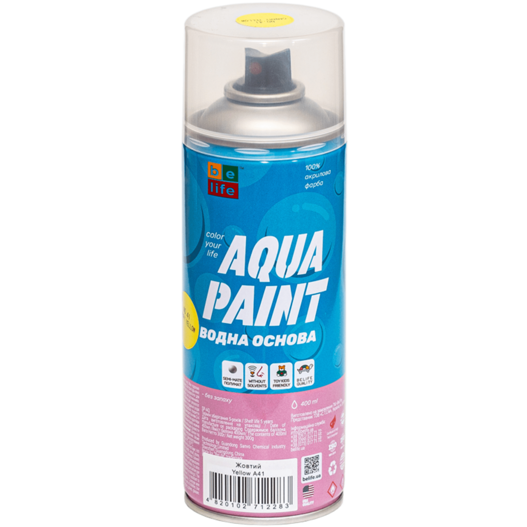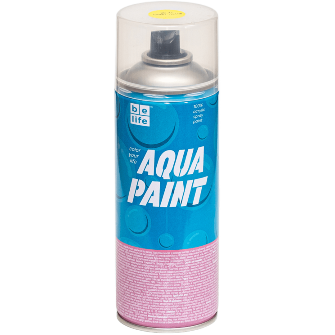 BeLife Spray Aqua – аэрозольная краска на водной основе, не содержащая растворителей. Не повреждает полистирол, практически без запаха. Краска имеет высокий уровень укрывистости, сочные цвета. Предназначена для покраски материалов любого типа: пластик, дерево, камень, металл, лоза, картон, ткань, керамика, стекло. Подходит для покраски полистирола, детских игрушек. Применяется внутри и снаружи помещений. Имеет матовую фактуру.