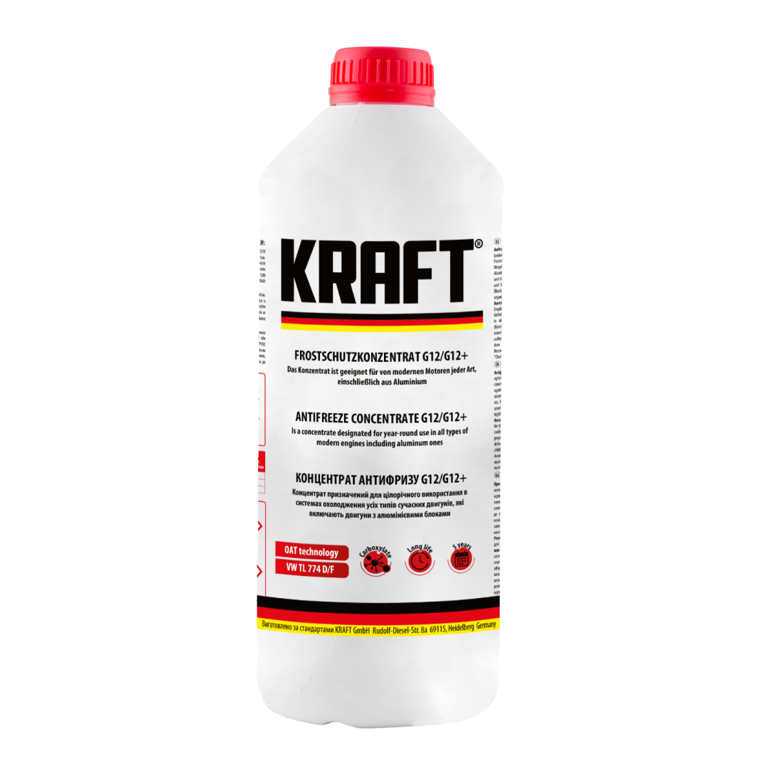 Описание Антифриз концентрат -35 °C KRAFT G12/G12+ красный, 1.5 л (KF103)