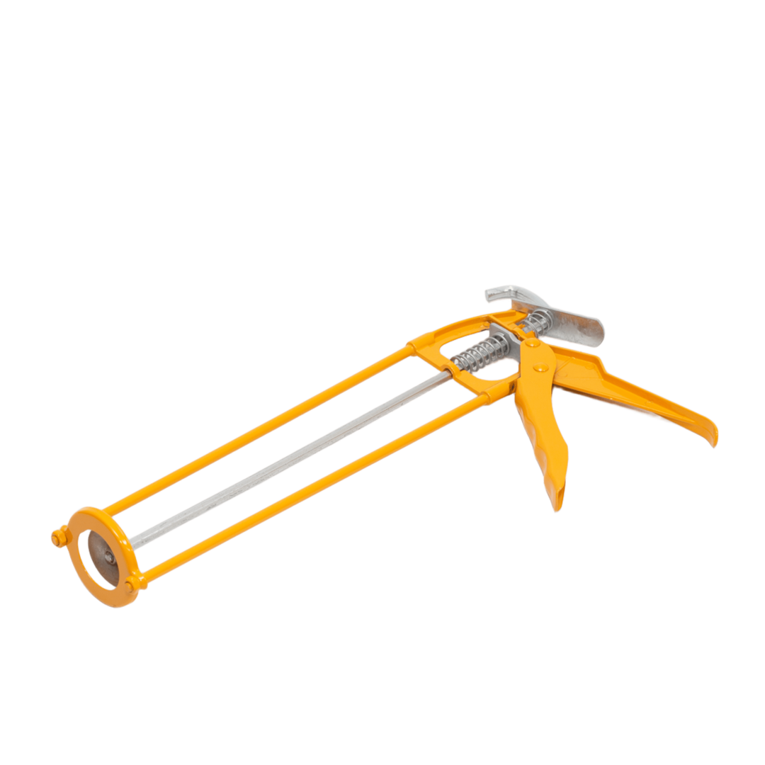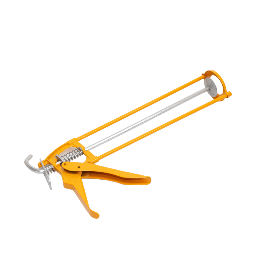 Способ применения пистолета: сначала нужно ослабить зажим-фиксатор, благодаря чему поршень легко можно сдвинуть вверх. Вставить в корпус трубу с герметиком или жидкими гвоздями. Постепенно сжимать рукоятку до упора, выдавливать силикон или клей.