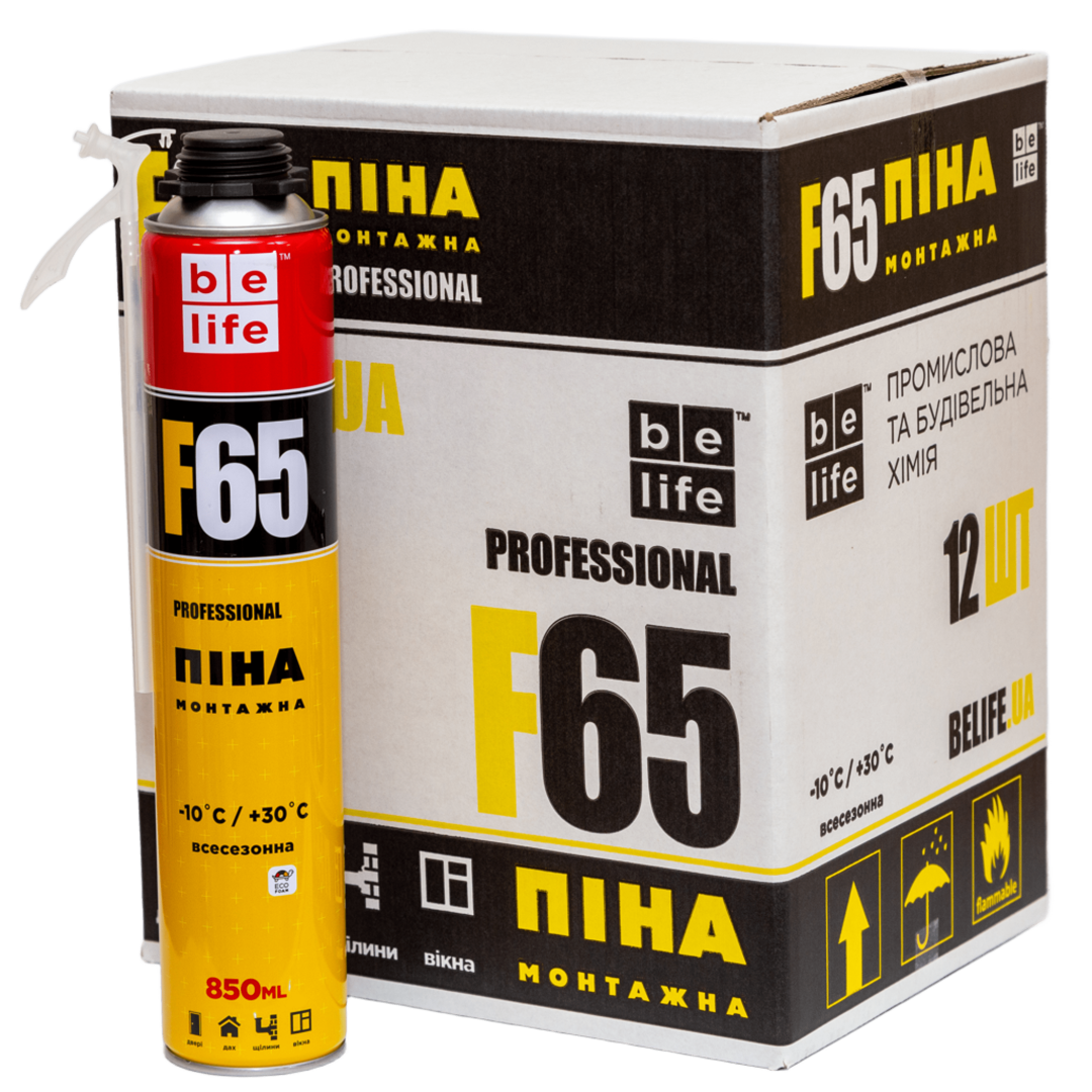 BeLife PRO-F65 однокомпонентная профессиональная монтажная пена высшего качества. Премиум класс - А2. Отличается высоким выходом готовой пены, до 65 литров с баллона 850 мл, в зависимости от рабочих условий: температуры, влажности воздуха и т.д. Отличная адгезия к большинству строительных материалов: бетон, камень, металлы и др. Равномерное расширение и мелкопористая структура ячеек способствует качественному заполнению рабочих отверстий. Газ, который используется в балонне Не содержит хлорфтору-углеводородов (фреон), абсолютно невреден для озонового слоя. Наносится с помощью монтажного пистолета. Морозостойкость -10℃ до +30℃.